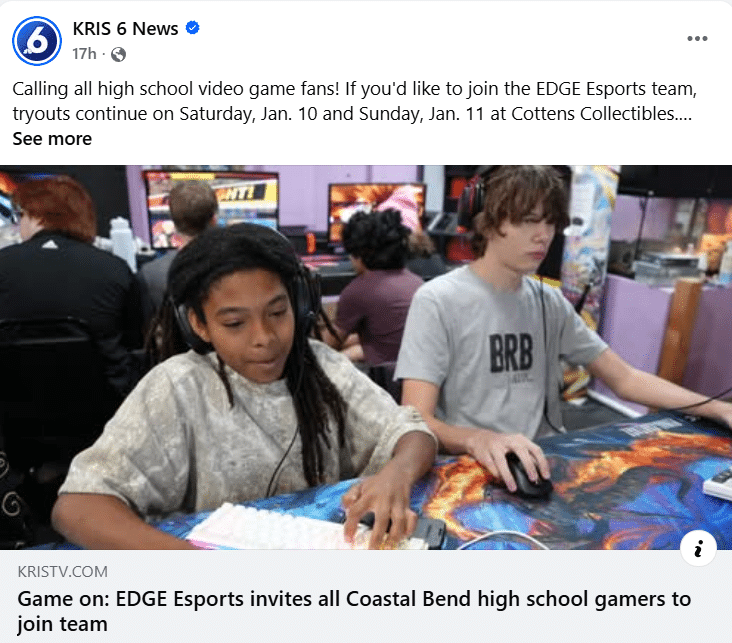 The EDGE Esports Foundation just got an amazing local spotlight – KRIS 6 News aired a fantastic segment on our Competitive Esports Program, highlighting our tryouts, new coach, and the transformative opportunities we’re bringing to Coastal Bend middle school and high school gamers!